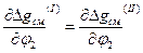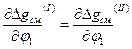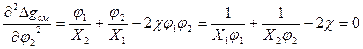 Линия бинодали соответствует точкам минимума на кривых зависимостей Δgсм от состава смеси при различных температурах и, соответственно, уравнения бинодали составляются из условий равенства химических потенциалов компонентов в различных фазах. Число уравнений, которые должны быть одновременно решены для построения линии бинодали на фазовой диаграмме, в соответствие с правилом фаз Гиббса, равно: У=К(Ф-1), где К – число компонентов, Ф – максимальное число сосуществующих фаз. Для сосуществующих фаз, являющихся только аморфными, не способными переходить в парообразное и кристаллическое состояние как в случае некристаллизующихся полимерных композиций, максимальное их число равно числу компонентов в смеси вне зависимости от температуры и давления. Поэтому для таких композиций число уравнений, которые должны быть решены одновременно, равно числу компонентов, т.е. для бинарных систем должны быть решены два уравнения для двух сосуществующих фаз (I и II): Δ μ1I= Δ μ1 II иΔ μ2I= Δ μ2II, или