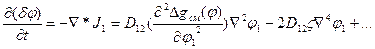 Кинетика роста фаз при спинодальном распаде описывается потоками компонентов, связанными с коэффициентами трансляционной диффузии макромолекул уравнением Фика, в котором градиент концентрации или активности заменен на разность химических потенциалов, рассчитываемых как первая производная свободной энергии по составу. Так, поток компонента 1 в расплаве смеси 1-2 равен: