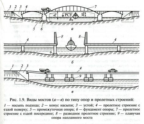 разводные, в которых для пропуска судов устраивают специальный разводной пролет путем поворота относительно опор в вертикальной плоскости половин пролетного строения (рис. 1.9, б) или путем подъема пролетного строения на необходимую высоту.