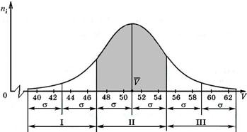 Согласно правилу трех сигм считаем, что практически вся совокупность маек от 40-го до 62-го размеров попадет в интервал длиной 6s. При этом в центральную часть распределения (см. рис. 2.8) попадают размеры 48, 50, 52 и 54, им разумно присвоить условный размер II.На эти размеры всей совокупности будет приходиться примерно