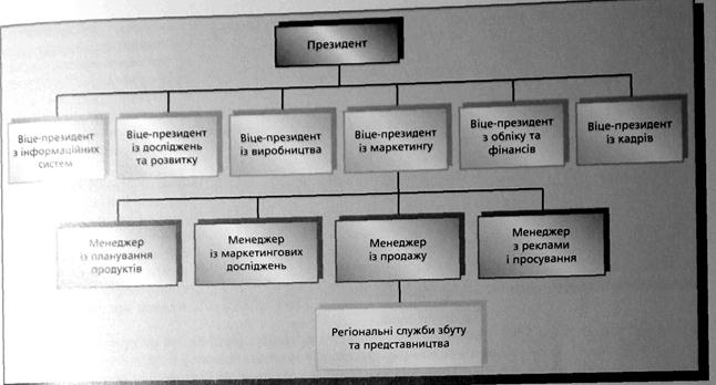 На рис.5.4. изображена схема типовой организационной структуры фирмы производителя, которая показывает некоторые элементы структуры службы маркетинга. Вице-президенту по маркетингу подчиняются четыре менеджера разных направлений маркетинговой деятельности: менеджер по планированию продуктов, менеджер по маркетинговым исследованиям, менеджер по продажам, менеджер по рекламе и продвижению. В зависимости от размера компании в ее штат может входить несколько специалистов по планированию продукции, каждый из которых отвечает за отдельную товарную линию. Кроме того, у менеджера по продажам могут быть подчиненные, которые отвечают за определенные регионы, а также специалист международного сбыта. Такая организация маркетинга призвана воплощать в жизнь планы маркетинга.
