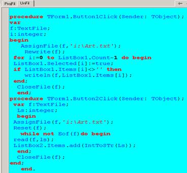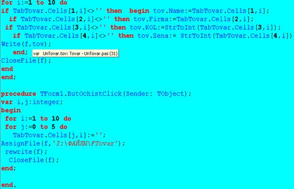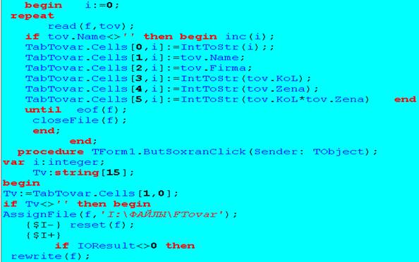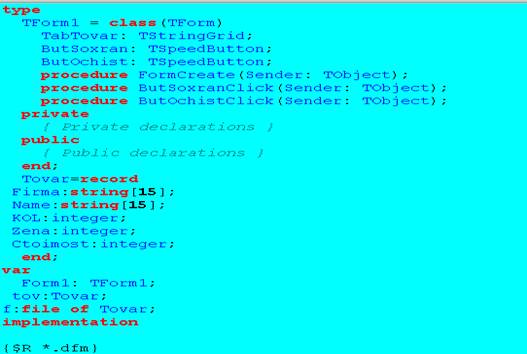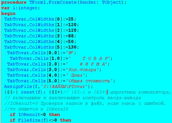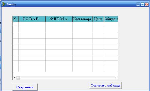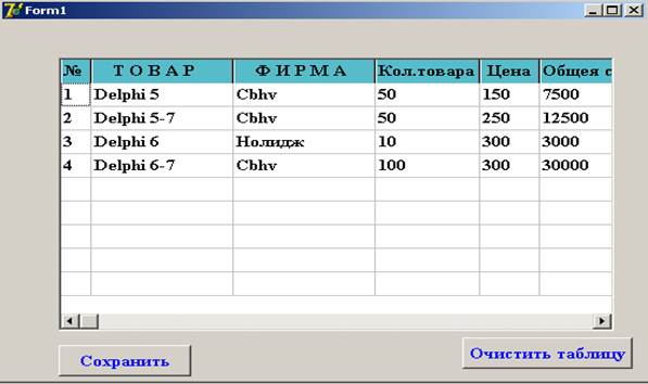 Цель работы – показать создание типизированного файла и последующую его обработку и дополнение на ниже следующем проекте, компонентами которого являются: Таблица(Stringgrid)и две кнопки(SpeedButton). Наименования полей таблицы являются наименованиями полей записи(record), см. объявления полей кода. При запуске программы на выполнение появится следующая таблица, в которую заносятся данные в поля №, ТОВАР, ФИРМА, Кол.товара и Цена, после чего сохраняются. При следующем открытии заполняется поле Общая стоимость и добавляются данные в таблицу и тем самым в файл.