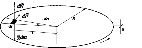 Момент сил трения, действующих на весь диск, алгебраически складывается из моментов сил трения, действующих на элементарные участки диска массой dm, и направлен перпендикулярно его плоскости (рис.5.3).
