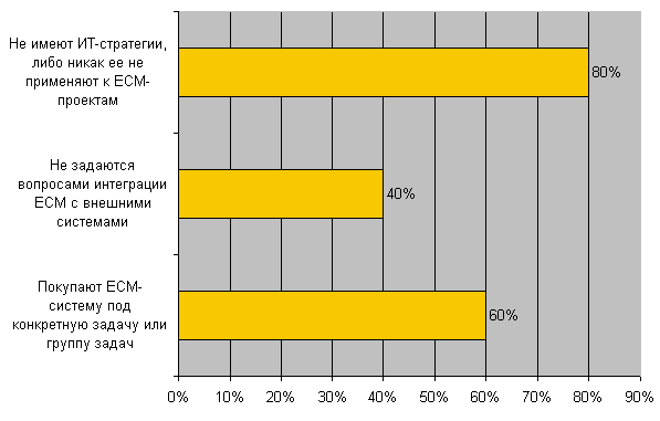 Однако пока "открытые" решения в большей степени привлекают (и ориентируются на) малый бизнес. Критически же важные системы для крупных распределенных предприятий пока по-прежнему поставляют "большие" игроки. Несколько тормозит этот сектор и существующее на сегодня довольно скромное предложение "открытых" ЕСМ.