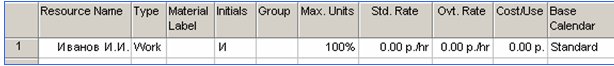 В списке ресурсов трудовой ресурс может быть представлен не только конкретным человеком, но и названием профессии или специальности: например, "программист" или "редактор" - когда неважно, кто персонально будет назначен на данную задачу. Для такого ресурса поле Max. Units (Макс. единиц) может иметь значение, превышающее 100%, т.к. в качестве данного ресурса может быть задействовано сразу несколько исполнителей. Поле Max. Units (Макс. единиц) недоступно для материальных ресурсов, т.к. они являются потребляемыми.