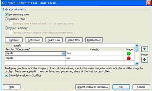В настраиваемом поле можно использовать не только текстовые и цифровые данные, но и рисунки. Это так называемые цветовые индикаторы. Цвет индикатора зависит от выполнения или невыполнения логического условия. Откроем файл project1. mpp. Создадим поле "обновлена". В принципе, индикатор можно отобразить и в самом поле "Общее время редактирования статьи", но мы создадим новое поле типа "флаг", чтобы показать, как работать с полями такого типа. В диалоговом окне переименуем поле Flag1(Флаг1) в "Обновлена". Затем в окне настройки формулы для него введем формулу [Duration2]=[Work] ([Длительность2]=[Трудозатраты]). Поля-флаги могут содержать только значение Yes "Да" или No"Нет". Если общее время редактирования статьи равняется трудозатратам, то поле будет содержать значение "Да". Для отображения индикатора в окне настройки поля выберем для Values to display (Отображаемые значения) кнопку Graphical Indicators (Графические индикаторы). Откроется новое диалоговое окно. В нем настраиваются критерии отображения индикаторов для разных задач. В верхней части окна есть переключатель для типа задач (суммарные или не суммарные). Для каждого из них можно установить свои критерии. Если установлены оба флажка в этом переключателе, то тем самым, настраивая параметры обычных задач, вы автоматически будете задавать параметры для всех остальных задач проекта. Настройка индикаторов производится в центре окна. В первой колонке выбирается логическая операция, во второй значение для проверки, и в последней рисунок индикатора. Проверка значения поля выполняется по очереди сверху вниз. Для перемещения условия по списку вверх или вниз служат стрелки сбоку.
