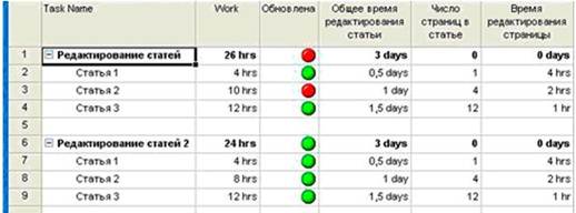 Если нужно увидеть значение поля, скрытого индикатором, то следует установить флажок Show data values in ToolTips (Показывать значения данных во всплывающих подсказках). Тогда данные будут отображаться при наведении курсора на индикатор. Иногда может произойти рассогласование данных индикаторов в файле. Дело в том, что для индикатора суммарной задачи необходимо задавать формулу расчета значения для суммарных задач. В противном случае получится, что его данные можно будет редактировать. Чтобы сделать это перейдем в диалоговое окно настройки полей и выберем операцию суммирования для поля "Обновлена" в окне выбора задач. В нашем примере нам подходит логическая операция "И". Как выглядят результат сведения задач можно посмотреть на рисунке. Здесь у суммарной задачи "редактирование статей "индикатор красного цвета, поскольку у одной из подчиненных задач обновление не было сделано (это отмечено индикатором красного цвета для этой задачи).