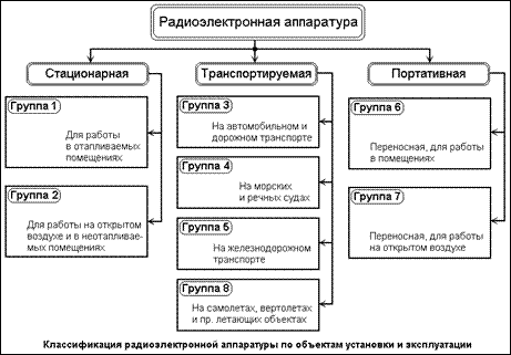Характер и интенсивность воздействия внешних дестабилизирующих факторов зависят от методов использования и объекта установки радиоэлектронной аппаратуры. По виду объекта установки РЭА можно разделить на три группы: стационарные, транспортируемые и портативные, техническое регламентирование которых приведено на рисунке.