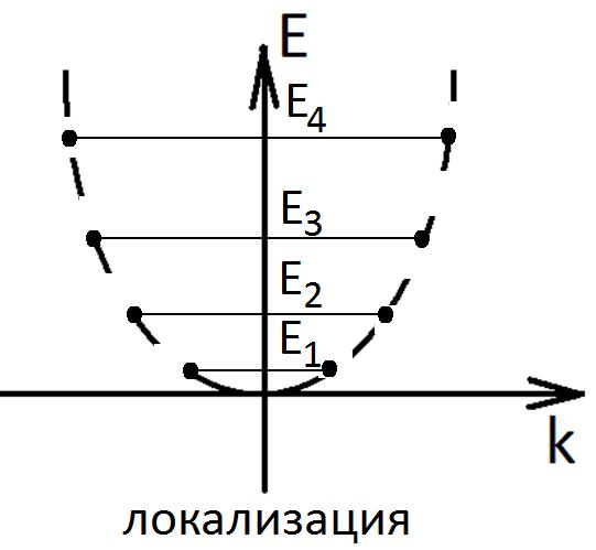 Энергетические уровни, занимаемые электронами в прямоугольной квантовой яме, могут принимать только дискретные значения. Это следует из закона дисперсии: