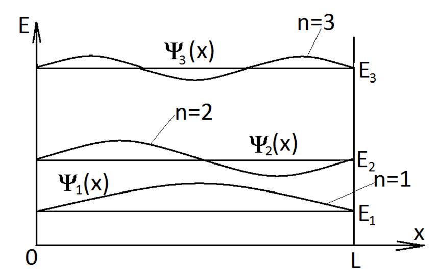 В структуре, размер которой L, по крайней мере в одном направлении ограничен и по своей величине сравним с длиной волны де Бройля возможны колебания в режиме стоячих волн с длиной волны