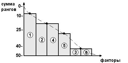 Для наглядности и возможного априорного отсеивания факторов можно построить диаграмму убывания влияния факторов. Для этого пользуются данными графы «сумма рангов». Причем, если самый значимый фактор оценивался «единицей», то отсчет начинают не с «нуля» по оси ординат, а с числа, несколько большего максимальной суммы рангов для отдельных факторов.