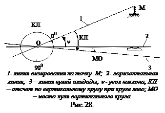 Формулы вычисления углов наклона зависят от оцифровки лимба. В теодолитах серии Т30 деления лимба оцифрованы от 00 до 3600 против часовой стрелки. При наведении на точку местности М при круге лево (КЛ) угол наклона n=КЛ–МО. Если перевести трубу через зенит и снова навести на точку М при круге право, то получим n=МО–(КП–1800). Производные от формул: n=[КЛ–(КП–1800)]/2; МО=[КЛ+(КП–1800)]/2.