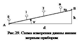 | В створе линии AB последовательно укладывают n раз мерный прибор, фиксируя концы шпильками 1, 2,...,n (или другим способом в соответствии с условиями измерений), и в конце измеряют остаток r0. Длину линии АВ приближенно вычисляют по номинальным значениям мерного прибора D0 = n L0 + r0, |