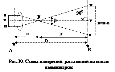 Для измерения небольших расстояний с относительной погрешностью не превышающей 1/300 при производстве съемочных работ применяются нитяные дальномеры, имеющиеся в зрительных трубах теодолитов. Схема измерения расстояний нитяным дальномером на рис. 30. В точке А устанавливается теодолит, в точке В - отвесно рейка с сантиметровыми делениями. Визирная ось трубы vv перпендикулярна рейке. Лучи от верхней и нижней