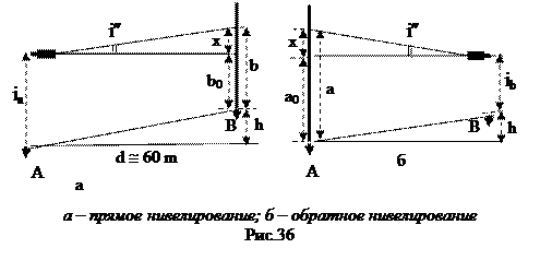 | На ровной местности закрепляют две точки А и В. Расстояние между ними примерно 40 м. Определяют превышение точки В над точкой А способом вперед в прямом направлении, рис.36,а, и в обратном направлении, рис.36, б. Пусть угол между осями i не равен нулю. Тогда отсчеты по рейкам a и b будут отклоняться от теоретических на х и превышние |