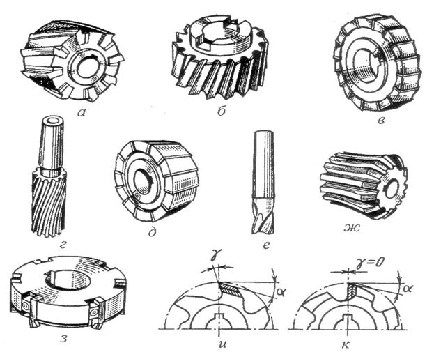 Фрезы изготовляют цельными (рис. 27, б, д) или сборными с напайными и вставными ножами (рис. 5.21, з). Режущие лезвия могут быть прямыми (рис. 5.21, д) или винтовыми (рис. 5.21, а). Фрезы имеют остроконечную (рис. 5.21, и) или затылованную (рис. 5.21, к) форму зуба. У фрез с остроконечными зубьями передняя и задняя поверхности плоские. У фрез с затылованными зубьями передняя поверхность плоская, а задняя выполнена по спирали Архимеда; при переточке по передней поверхности профиль зуба фрезы сохраняется.