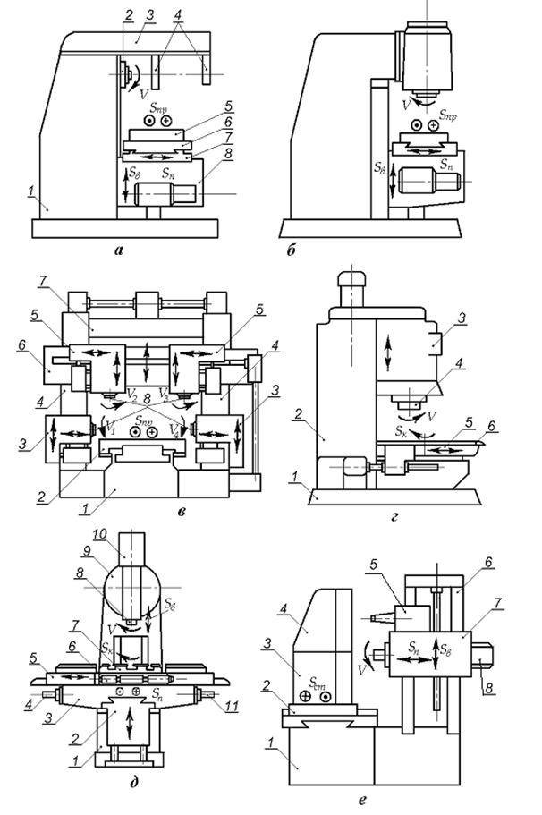 Продольно-фрезерные станки (рис. 5.22, в) бывают одно- и двухстоечные. Они предназначены для обработки крупных корпусных деталей в серийном производстве.