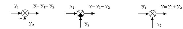 Элемент сравнения изображают в виде круга разделенного на секторы (рис. 5.1, а, б, в). В сравнивающем звене сектор, на который подается отрицательный сигнал, заменяют (рис. 5.1, б) или перед соответствующим входом ставят знак минус (рис. 5.1, а).
