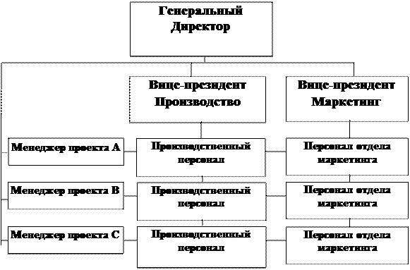 Таким образом, в матричной структуре существуют как функциональная структура, так и структура управления проектами. Поскольку специалисты, работающие в компании, объединены в функциональные подразделения и одновременно заняты выполнением проектов, то в матричной организации устанавливаются двойные каналы полномочий, ответственности, оценки и контроля.