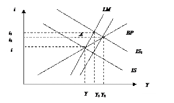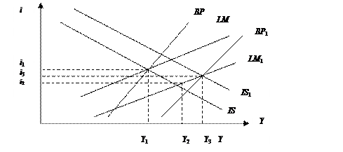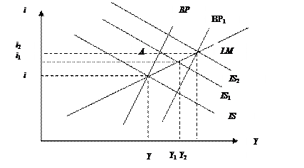 Кривая IS переместится к IS1. Ставка процента увеличится, что будет способствовать притоку капитала, формированию положительного сальдо счета финансовых операций. Из-за низкой мобильности капитала сальдо платежного баланса формируется отрицательным. Такая ситуация ослабляет национальную валюту, кривая ВР перемещается к ВР1, экспорт увеличивается, сальдо счета текущих операций выравнивается, увеличение дохода от роста экспорта увеличит ставку процента и продолжит приток капитала из-за рубежа, восстанавливая равновесие платежного баланса.