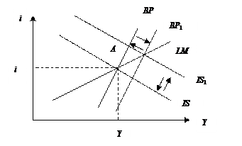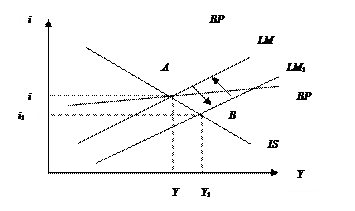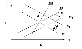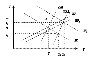 Снижение процентной ставки способствует формированию отрицательного сальдо счета финансовых операций и платежного баланса в целом. Курс национальной валюты начинает снижаться, кривая ВР перемещается к ВР 1, экспорт увеличивается, кривая IS перемещается к IS 1, общий уровень дохода возрастает до Y 2.