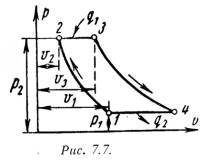 1-2 - адиабатное сжатие до давления Р2; 2-3 – подвод теплоты q1 при постоянном давлении Р2 (сгорание топлива); 3-4 – адиабатное расширение до первоначального давления Р1; 4-1 – охлаждение рабочего тела при постоянном давлении Р1 (отвод теплоты q2);