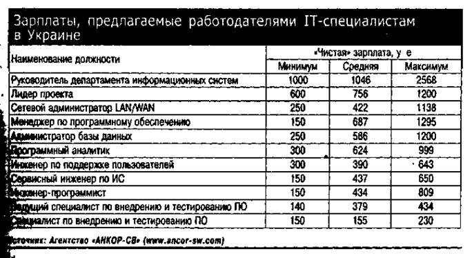 Наибольшие зарплаты предлагаются руководителям IT- отделов (700-1500 у. е.), ведущим программистам (600-1000 у. е.). Отмечается, что за последние два года зарплаты значительно возросли. Если в 2001 г. системный администратор получал около 250 у. е., то теперь 450-600, а средняя заработная плата программиста составляет 400-500 у. е. Зарплаты, которые работодатели готовы платить по некоторым IT -специальностям, представлены в таблице.