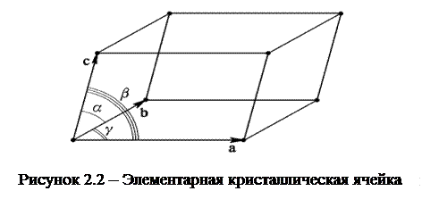 В основе кристаллической решетки лежит элементарная кристаллическая ячейка, представляющая собой параллелепипед минимального объема с характерным для данной решетки расположением атомов (рисунок 2.2). Если взять большое число одинаковых кристаллических ячеек и вплотную уложить их в определенном объеме, сохраняя параллельность ребер и граней, то мы будем иметь пример строения идеального монокристалла.