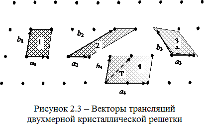 Все изображенные на рисунке 2.3 пары векторов a и b являются векторами трансляций решетки. Однако векторы a4 и b4 не являются примитивными векторами трансляций, поскольку вектор трансляции кристаллической решетки T нельзя выразить как Т = n1 a4 + n2 b4, где n1 и n2 – целые числа. Все остальные пары векторов a и b можно выбрать в качестве векторов примитивных трансляций. Параллелограммы 1, 2, 3 имеют равную площадь и любой из них можно выбрать в качестве плоской примитивной ячейки.