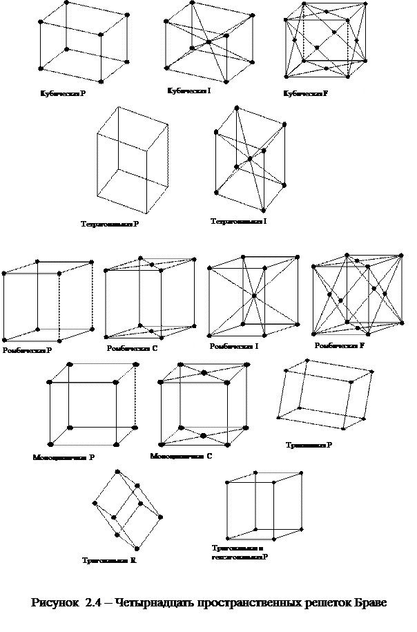Различают примитивные (простые), базоцентрированные, объемно-центрированные и гранецентрированные решетки Браве. Если узлы кристаллической решетки расположены только в вершинах параллеле-пипеда, представляющего собой элементарную ячейку, то такая решетка называется примитивной или простой, если, кроме того, имеются узлы в центре оснований параллелепипеда, то решетка называется базоцентри-рованной, если есть узел в месте пересечения пространственных диагоналей, – решетка называется объемноцентрированной, а если имеются узлы в центре всех боковых граней, – гранецентрированной.