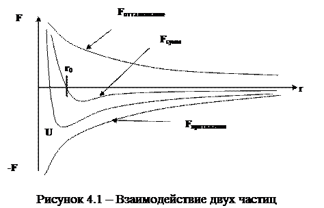 До сих пор мы не учитывали природу сил, удерживающих частицы в строго упорядоченном положении. На самом деле необходимо учитывать природу этих сил, так как она определяет энергию связи в решетке и основные ее свойства. Рассмотрим силы взаимодействия и соответственно энергию связи для двухчастичной модели (рисунок 4.1).