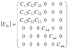 Полное число упругих констант сокращается в зависимости от симметрии кристалла. Так, если кристалл обладает триклинной симметрией, то полное число упругих констант равно 21, а для кристаллов кубической симметрии оно равно 3. Основное свойство кубического кристалла состоит в том, что направления ±х, ±y, ±z взаимно перпендикулярны и полностью эквивалентны. Это приводит к тому, что для кубических кристаллов имеется лишь три независимые компоненты и набор постоянных упругой жесткости сводится к матрице: