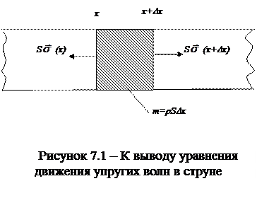 Рассмотрим распространение продольных волн в однородной неограниченной струне с линейной плотностью r. В этом случае движение каждого из элементов струны происходит лишь в направлении ее длины. При распространении продольной волны на элемент толщиной Dx (см. рисунок 7.1) действуют силы: слева Ss(x) и справа Ss(x+Dx), где S – площадь поперечного сечения струны, s(x) и s(x+Dx) – нормальные упругие напряжения.