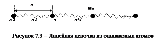 В качестве одномерной модели твердого тела рассмотрим цепочку из n одинаковых атомов с массой М и межатомным расстоянием а, которые могут перемещаться вдоль прямой линии (рисунок 7.3).