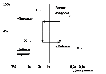 Знаки вопроса – новые товары, по которых конкурентные преимущества не ясны, требуется прогноз спроса и в зависимости от его результатов товар либо выводится из производственной программы, либо в него вкладываются значительные средства, и проводится активная маркетинговая политика.