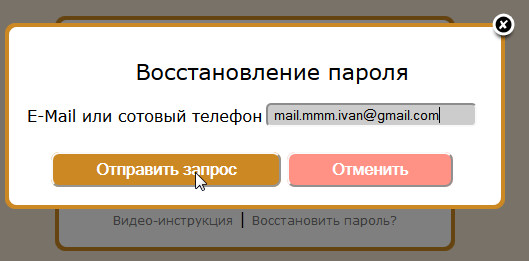 - 3.2. Нажмите "Восстановить пароль?" и в окне восстановления пароля введите Ваш e-mail, нажать "Отправить запрос"