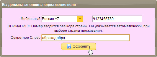 Возвращаясь к форме, когда нажмёте «Сохранить», заполнив сотовый номер и секретное слово, Вам придет SMS-сообщение с кодом подтверждения, который нужно вписать в появившееся на странице поле и нажать «Сохранить».
