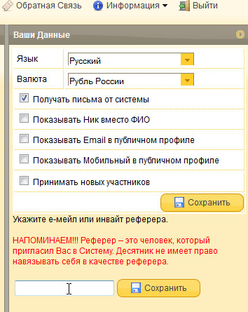Реферера можно указать в закладке «Мой профиль». Для этого необходимо указать е-мейл или инвайт реферера и нажать кнопку «Сохранить».