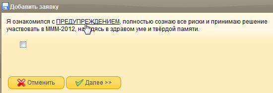 - Обязательно знакомимся с предупреждением, что Вы участвуете в Системе, которая является Финансовой Пирамидой - если Вы согласны участвовать, то подтверждаете свой выбор и нажимаете кнопку «Далее».