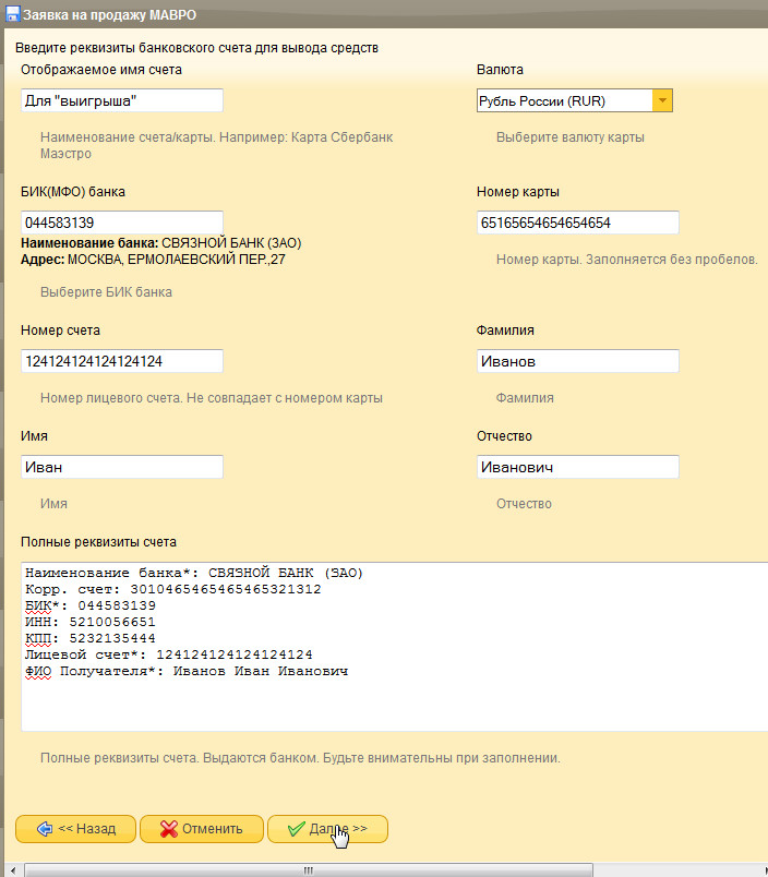 Далее самый важный пункт - заполнение реквизитов счета, на который Вы хотите получить помощь: