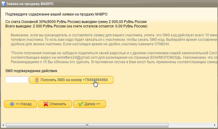 После того, как ввели сумму, нажимаем кнопку «Далее», теперь Вам нужно подтвердить SMS-сообщением запрос о помощи.