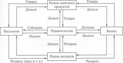 Выяснив роль правительства в создании общественных благ, можно составить схему кругооборота ресурсов, продуктов и доходов (рис. 1.2). С предпринимателей и с населения правительство собирает налоги. На собранные средства закупаются товары на рынке конечных продуктов (например, воинское обмундирование). На рынке ресурсов правительство покупает труд специалистов (например, юристов). Стрелки на рис. 1.2, направленные от правительства к населению и к бизнесу, соответствуют субсидиям малообеспеченных граждан, дотациям на производство нужных с точки зрения общества продуктов и услуг.