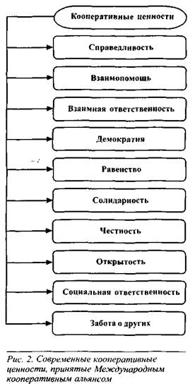 Во-вторых, кооперативные ценности поддерживают моральный престиж кооперативов и их объединений в обществе, т. е. регулируют отношения кооперативов с внешней средой. Кооперативные ценности вызывают доверие общества к кооперативам, обеспечивают им благоприятные нравственные предпосылки для развития.