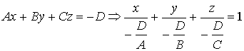 Рассмотрим общее уравнение плоскости Ax + By + Cz + D = 0. Перенесем свободный член в правую часть уравнения и разделим обе части уравнения на (– D). | |