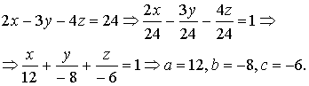 Задача 1. Найти точки пересечения плоскости 2 x - 3 y - 4 z -24 = 0 с осями координат.