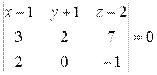 Пусть М (х, у, z) - текущая точка плоскости. В таком случае векторы M0M = (x − 1, y + 1, z − 2), M0M1 = (3, 2, 7) и p = (2, 0, − 1) компланарны. Запишем условие компланарности этих векторов в координатной форме