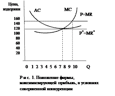 Функционируя на совершенно конкурентном рынке, фирма максимизирует прибыль при таком объеме продукции, при котором предельные издержки сравняются с ценой товара, устанавливаемой рынком независимо от действий фирмы. Данная прибыль (в размере заштрихованного прямоугольника на рис. 1) будет привлекать в отрасль новые фирмы. Это обусловит увеличение предложения и снижение цены товара, а, следовательно, и сокращение прибыли данной фирмы до уровня «нормальной прибыли» (на рис.1 кривая цены и предельного дохода сместится вниз на уровень P * и MR *). Оптимальный объем продукции данной фирмы также уменьшится.
