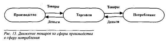 В условиях рыночной экономики доминирует обращение товаров, поэтому роль торговли как связующего звена между сферой производства и сферой потребления увеличивается. От торговли производители получают достоверную информацию о требованиях потребителей и изменении спроса на производимую продукцию. В соответствии с полученной информацией осуществляется производство товаров, необходимых потребителю. Торговля выступает посредником между производством и потреблением, обеспечивая воспроизводственный процесс, при этом розничная торговля завершает процесс обращения товаров (рис. 15):
