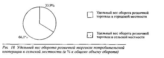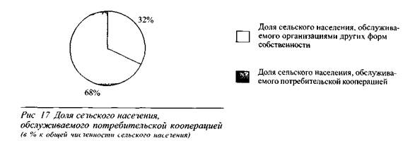 Розничная торговля потребительской кооперации обеспечивает удовлетворе-ние спроса на товары и услуги пайщиков и обслуживаемого населения, в основном сельских жителей. Поэтому потребительская кооперация в экономике страны имеет важное значение как сельская торговая система. В общей численности сельского населения (38,9 млн чел.) доля населения, обслуживаемого потребительской кооперацией, составляет около 70% (рис. 17).