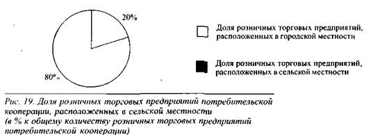 Большая часть розничных торговых предприятий потребительской кооперации расположена в сельской местности — 80,0% от их общего количества (рис. 19). Сложность обслуживания сельского населения связана с его расселением. Большая часть сельских поселений — это небольшие по числу жителей населенные пункты.